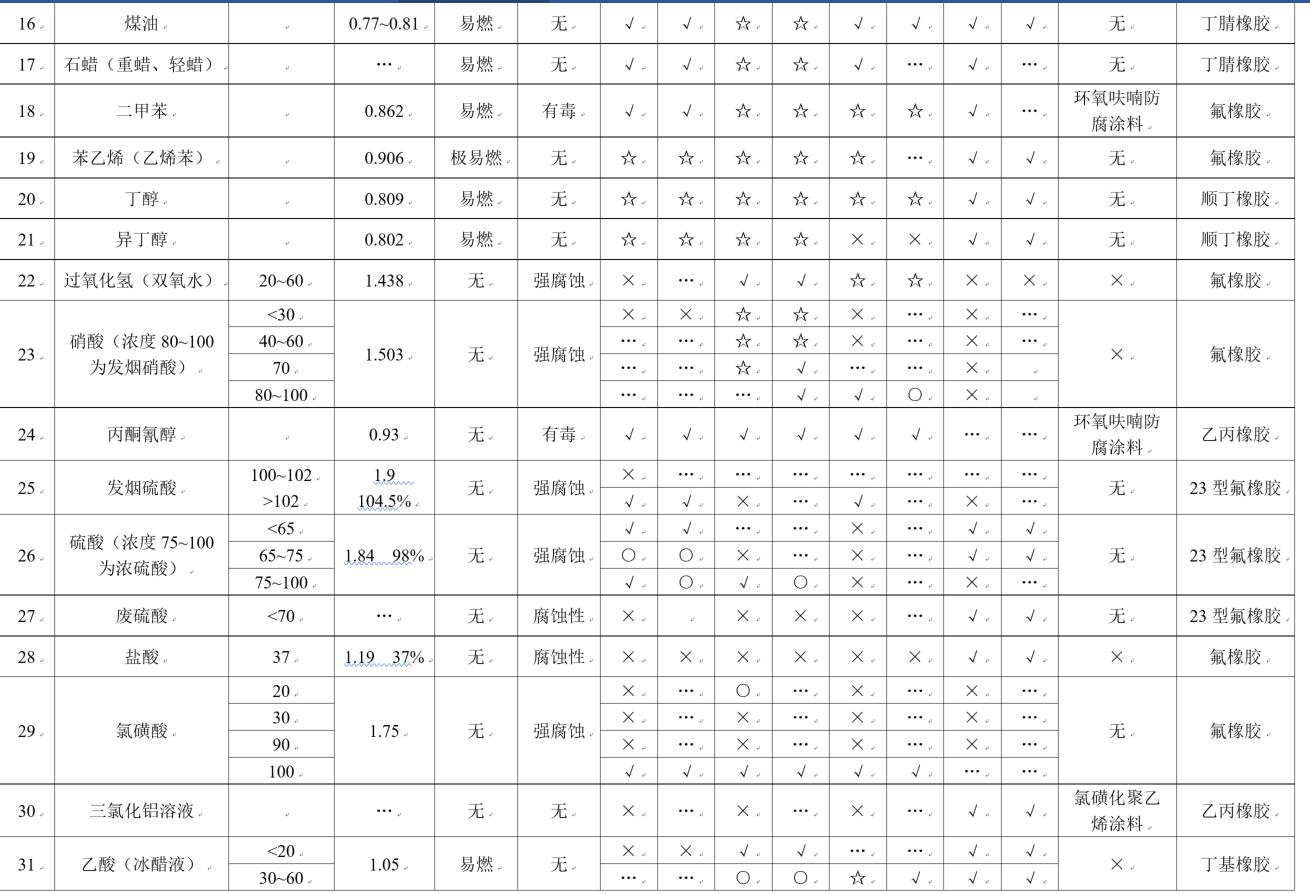 (1).罐體材料相容性符號含義:☆優(yōu)良;√良好;○可用但腐蝕較重;×不適用;…未知 (與溶體濃度、環(huán)境溫度有關);